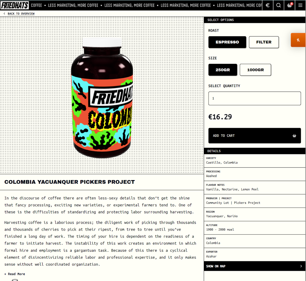 I first came across Friedhats on Reddit, in one of the many recurring threads titled something along the lines of “Where do you order your coffee?” Their distinctive web design certainly played a role in catching my attention, as did the specificity and confidence of their coffee descriptions. Call it naïve, but these details suggest a level of care—and intention—that goes beyond surface-level branding.