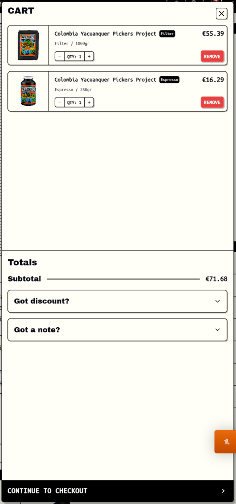 The overall purchasing process was straightforward. Browsing and selecting coffee was generally smooth, and the shopping cart interface is clear and well designed.