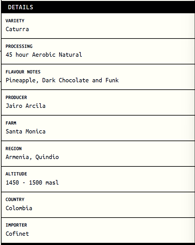 First up: Jairo Arcila Colombia. I’m fairly sure I’ve had coffee from Jairo Arcila before, though I can’t quite place when. Worth noting upfront: I’m generally biased toward Colombian coffees. There’s just something about them that reliably works for me—unlike Brazilian coffees, which tend to be more hit-or-miss in my experience (no shade intended).