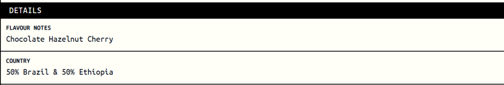 This is a 50–50 blend of Brazilian and Ethiopian coffees, aiming squarely at a classic chocolate-and-nut profile, with a touch of cherry listed as an accent. On the nose, it’s exactly what you’d expect from a solid house blend—something you’d happily encounter as a daily driver in many specialty cafés. Pleasant, familiar, and reassuringly “coffee-like,” without trying to be clever or surprising.